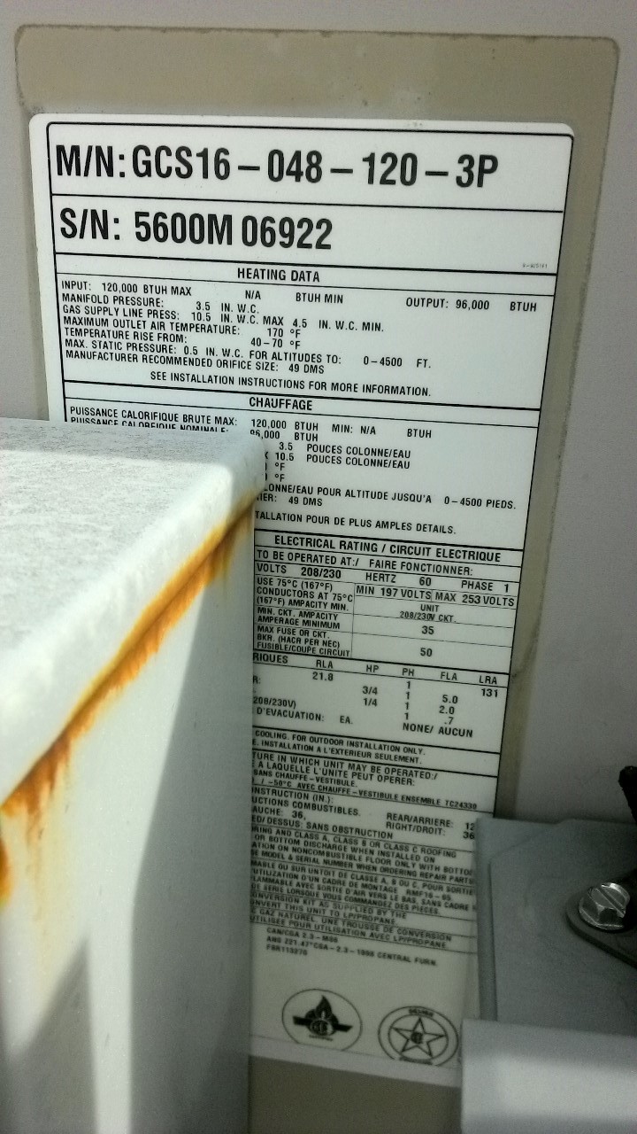 | GE# | Unit # | Mfg date | Model# | Serial# | Cool Tons | Heat btu's | Belts | |||
