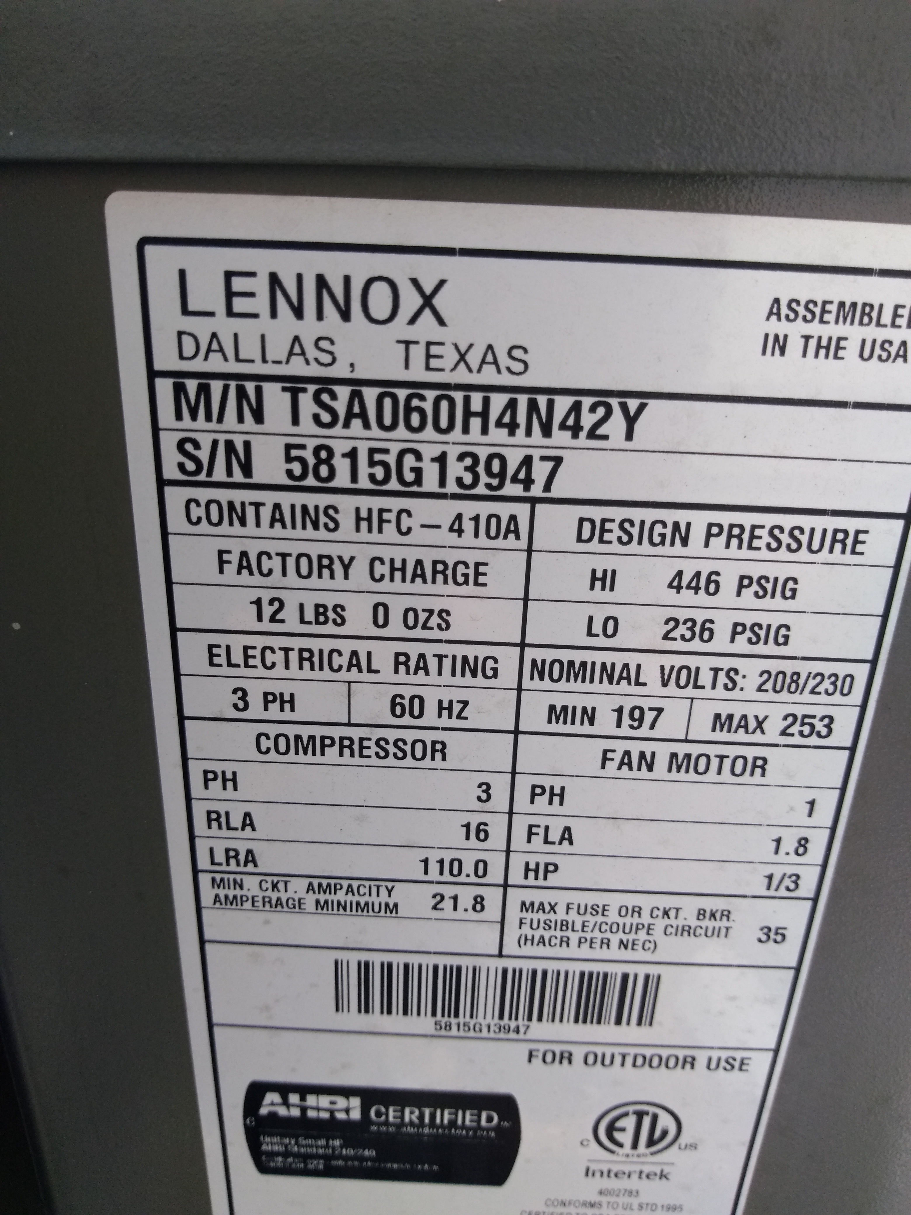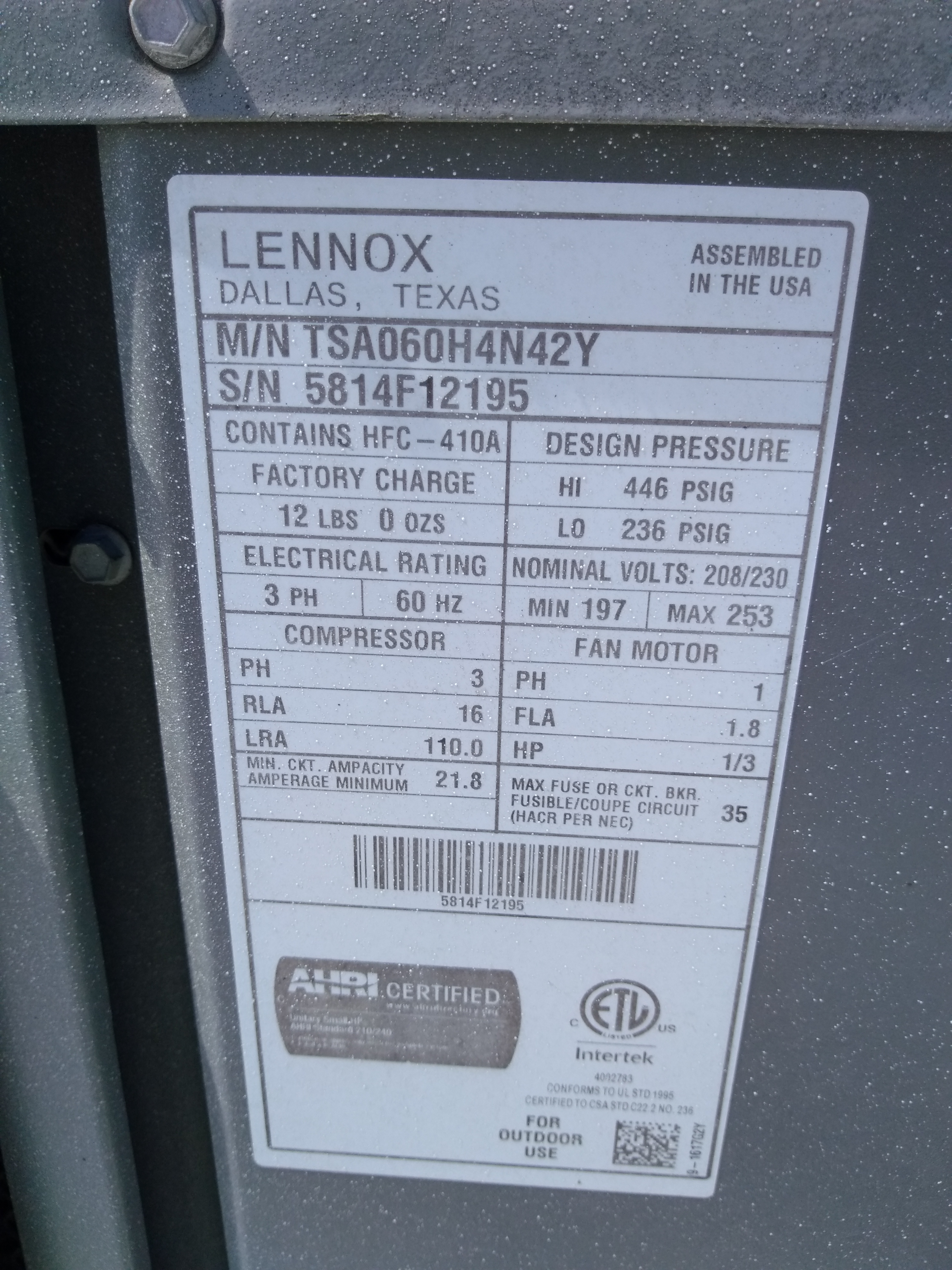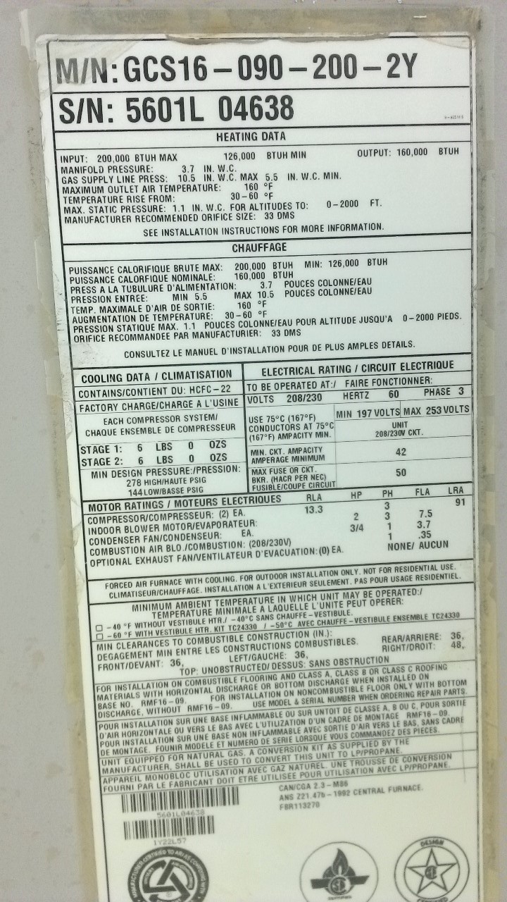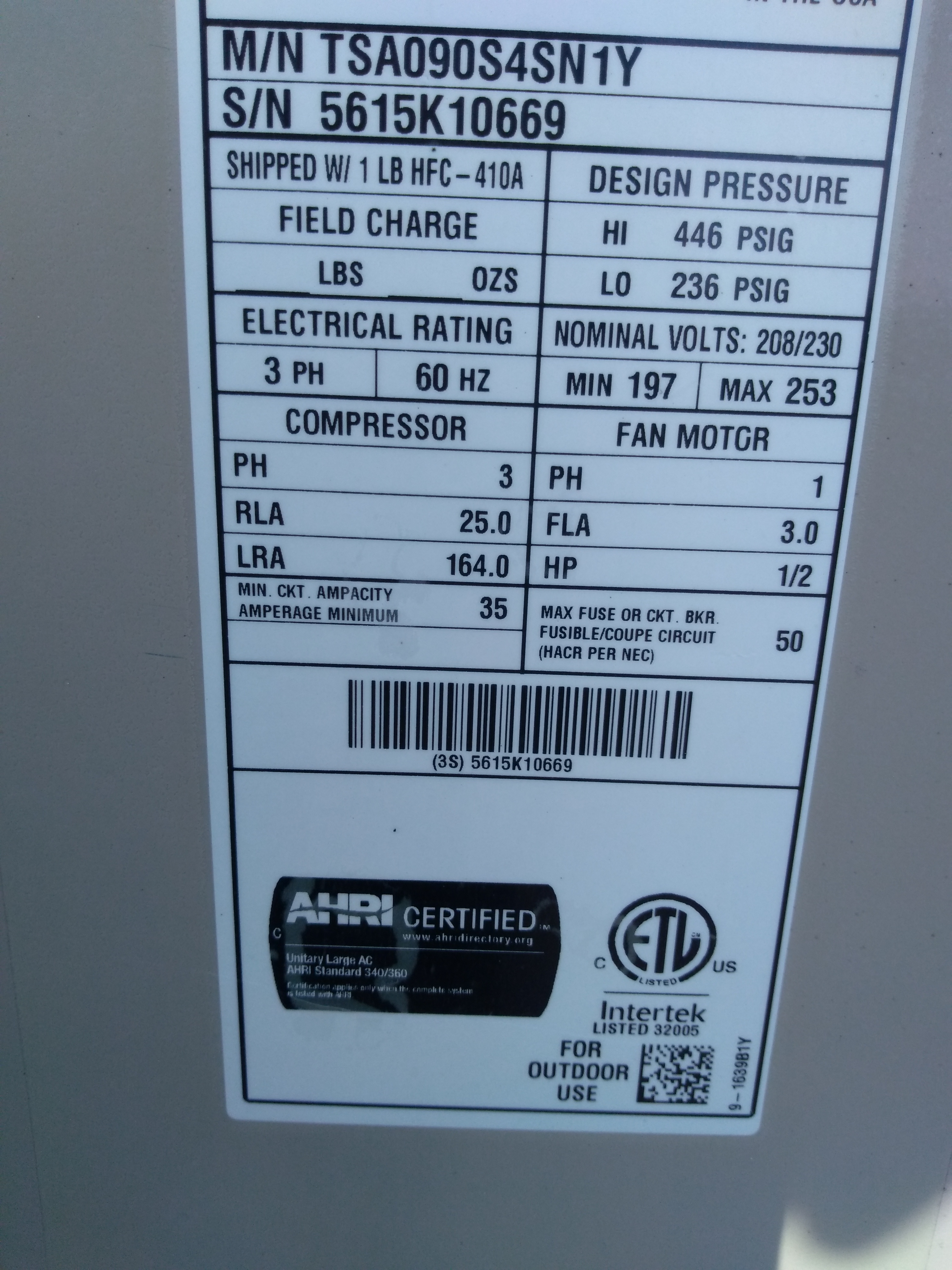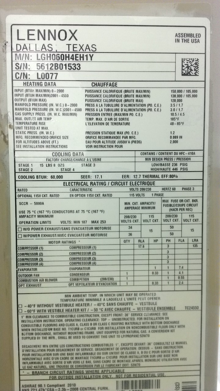 | 60 | n/a | 2015 | TSA060H4N42Y | 5815G13946 | 5 Ton | *** | Cond | |||