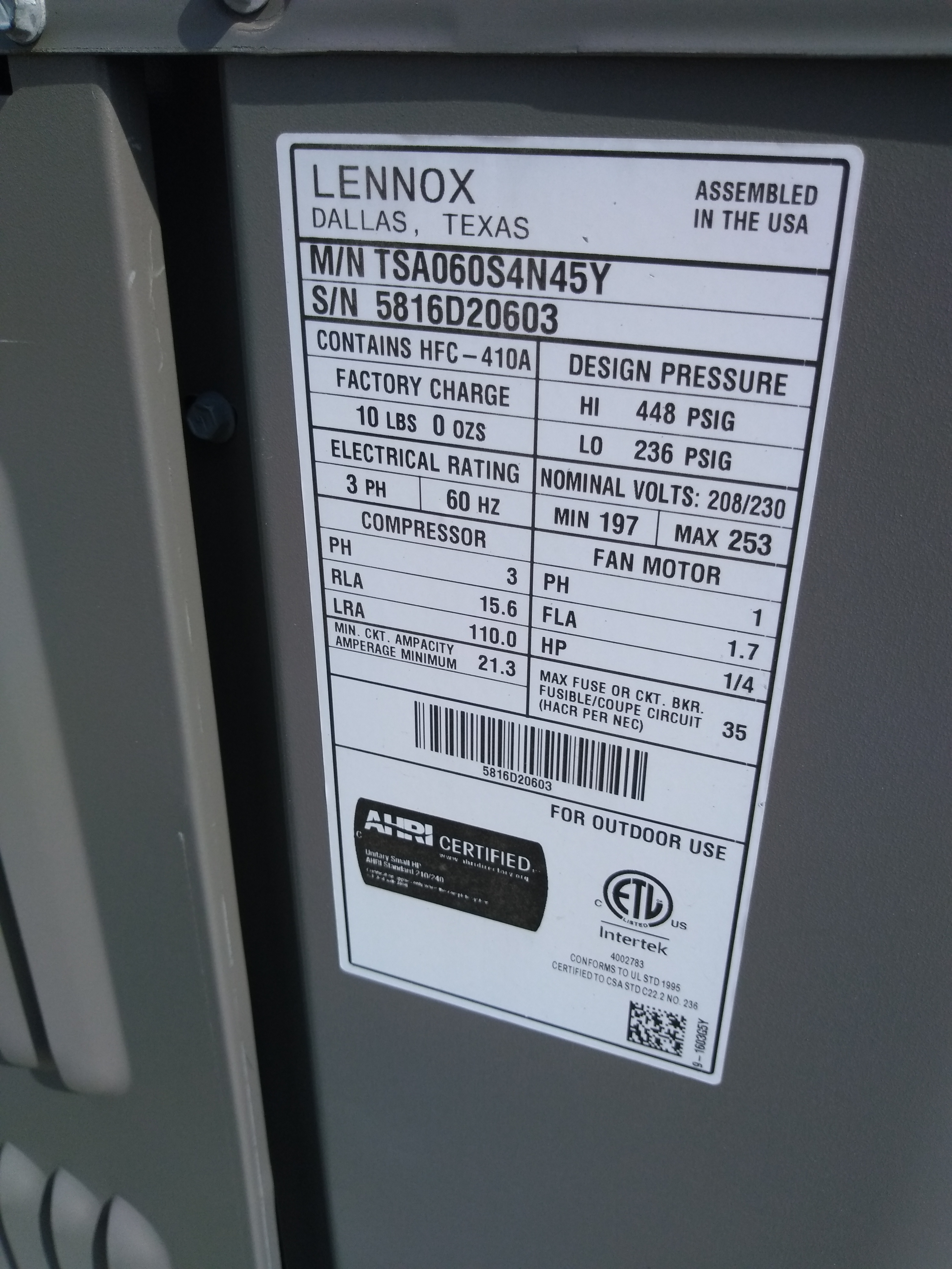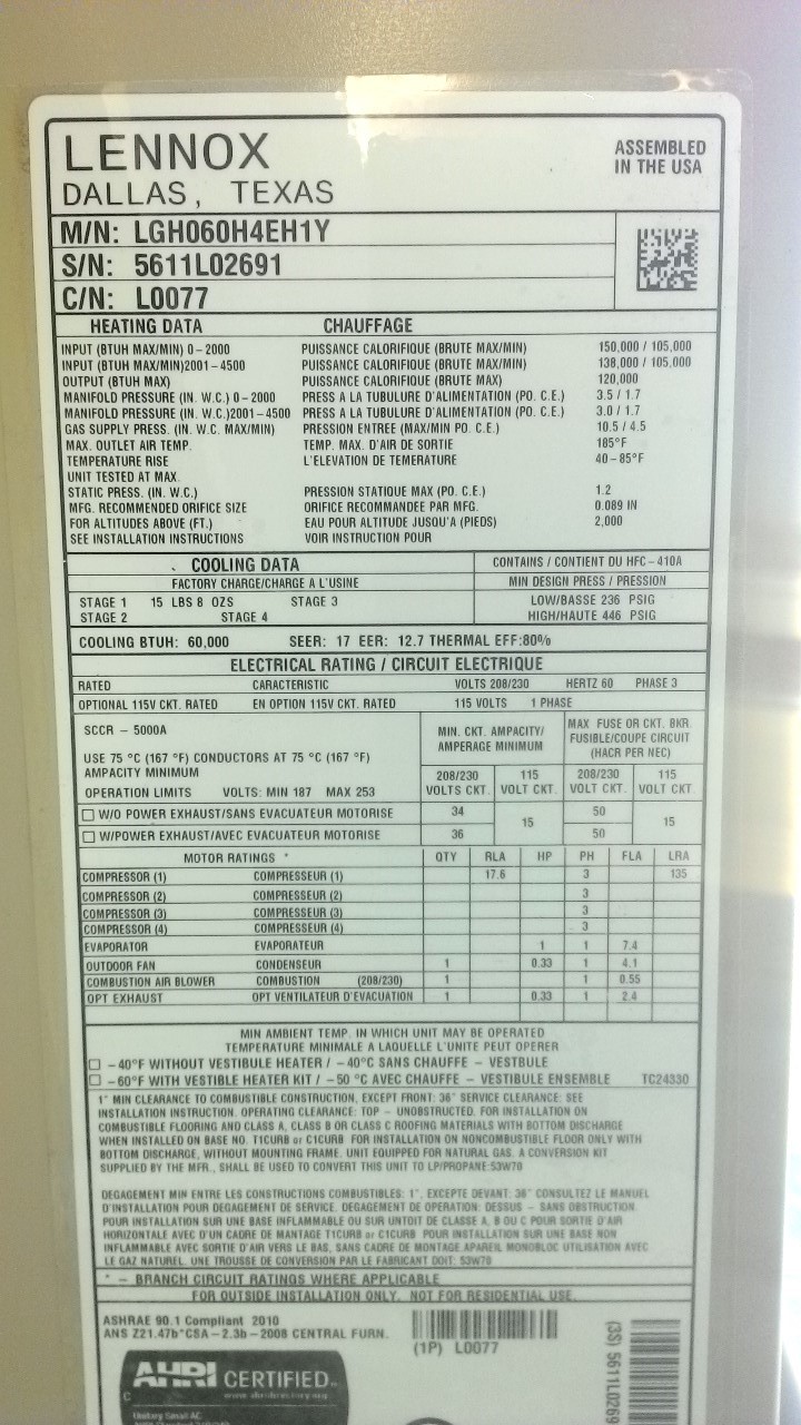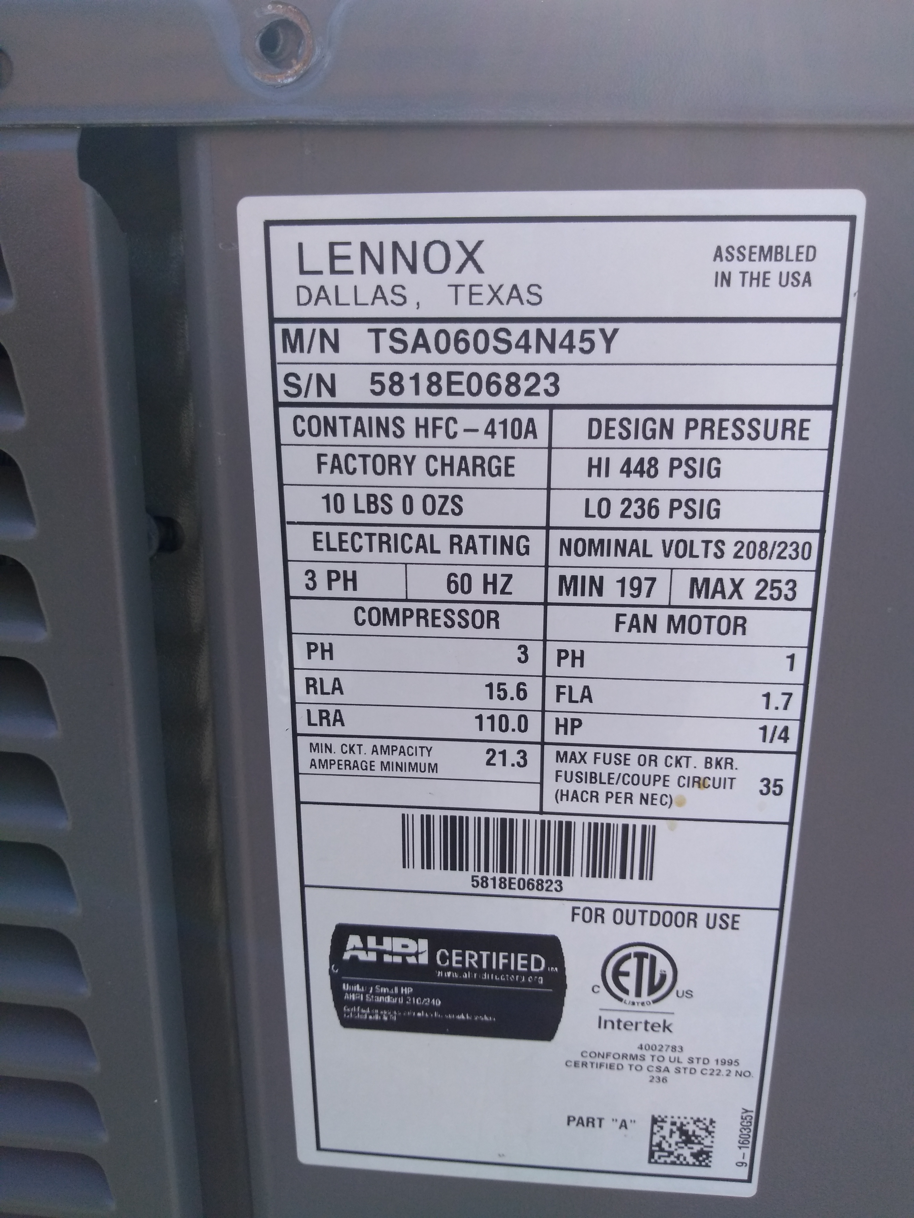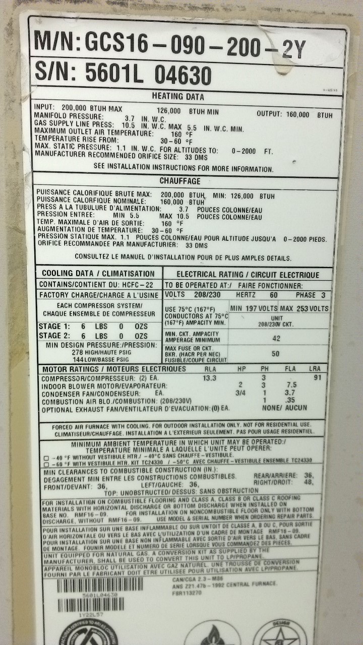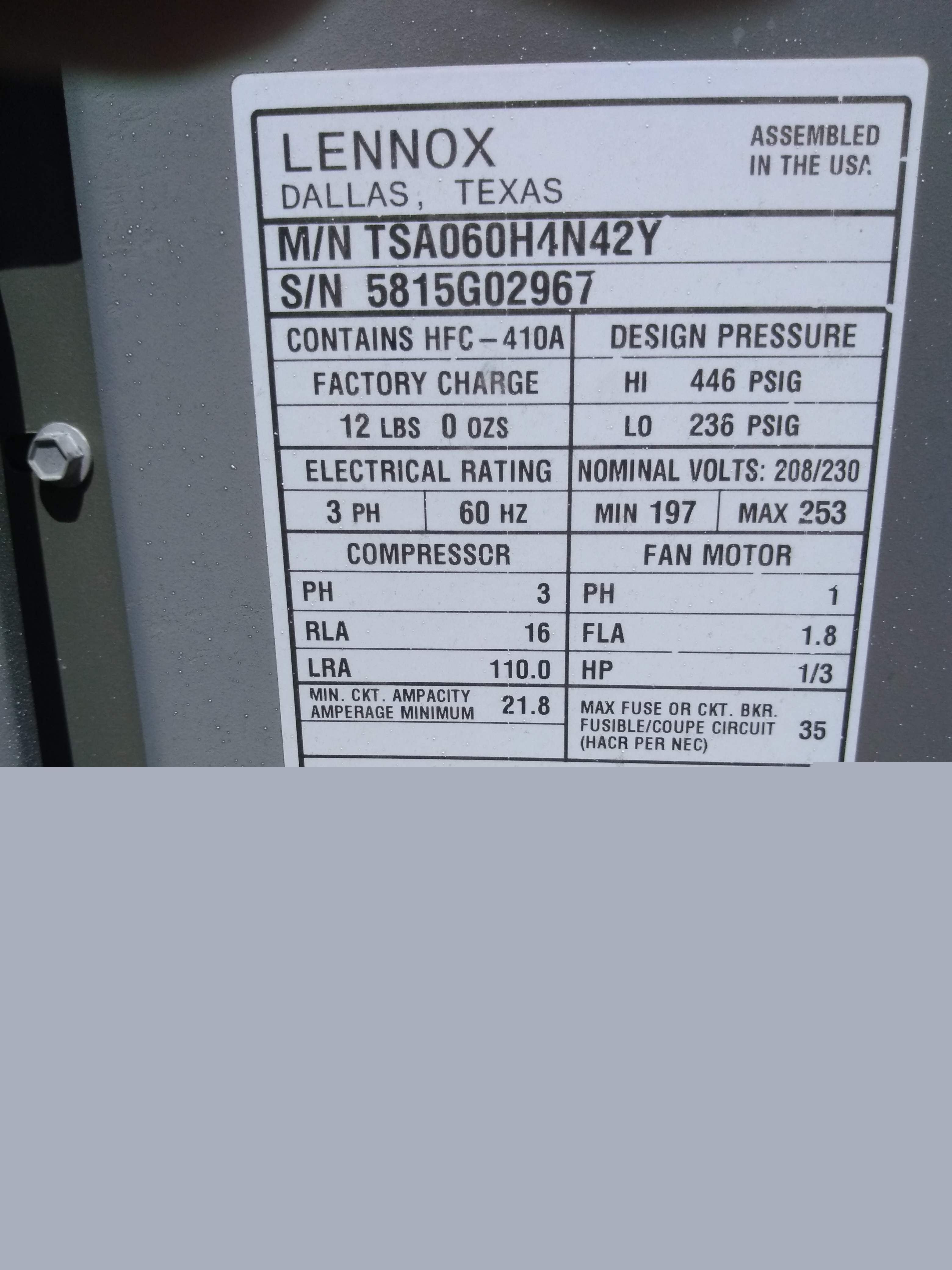 | 60 | n/a | 2015 | TSA060H4N42Y | 5815G13946 | 5 Ton | *** | Cond | |||