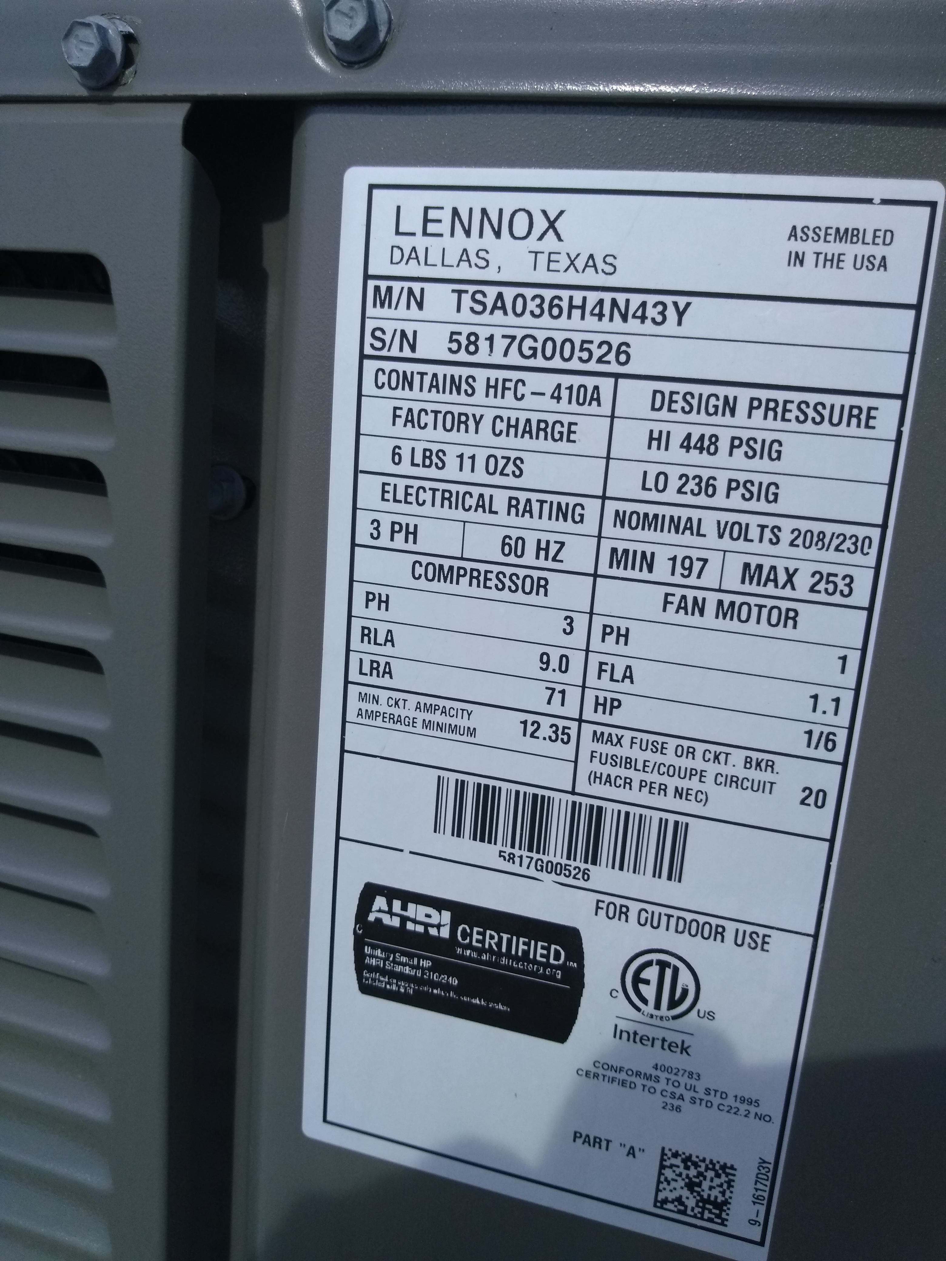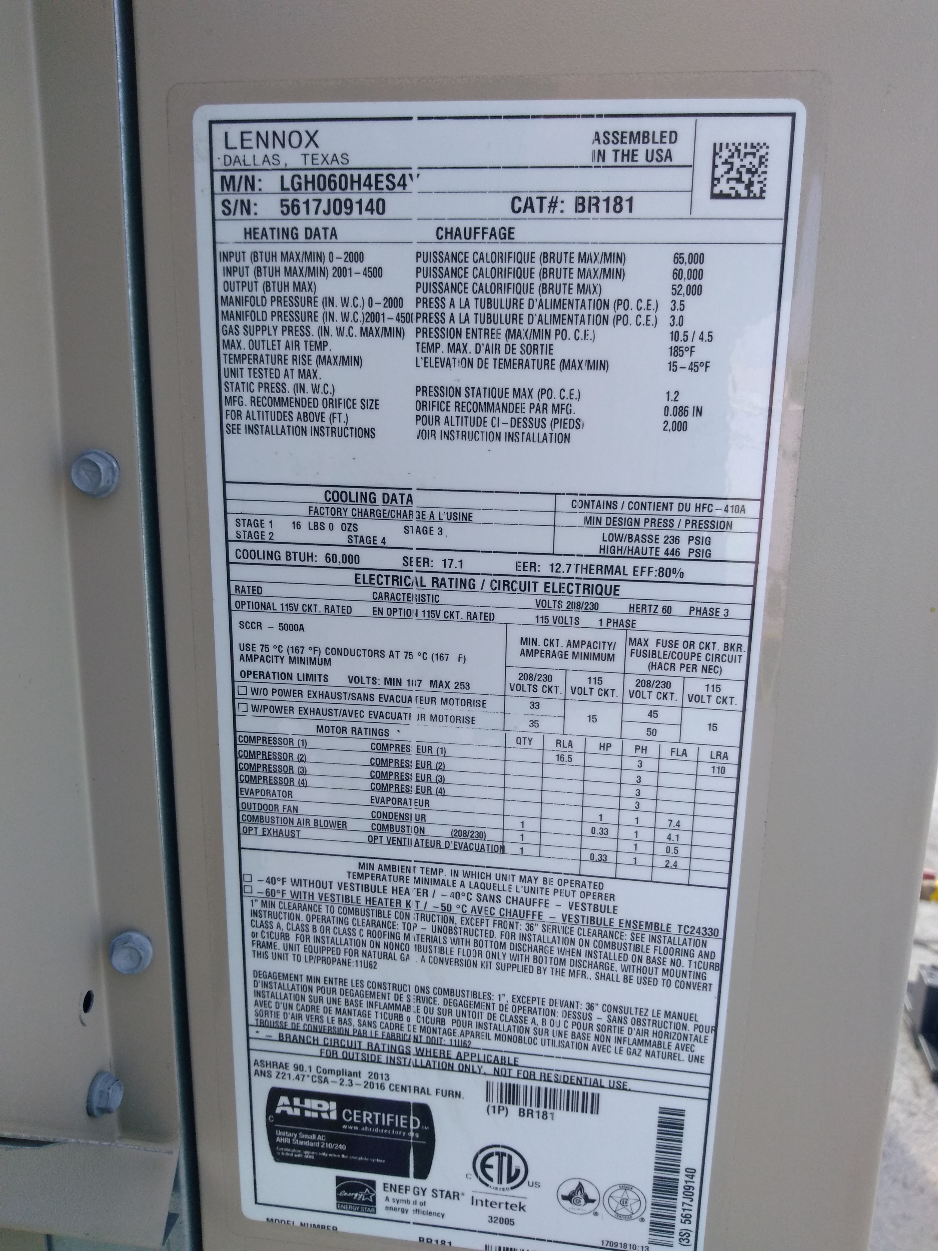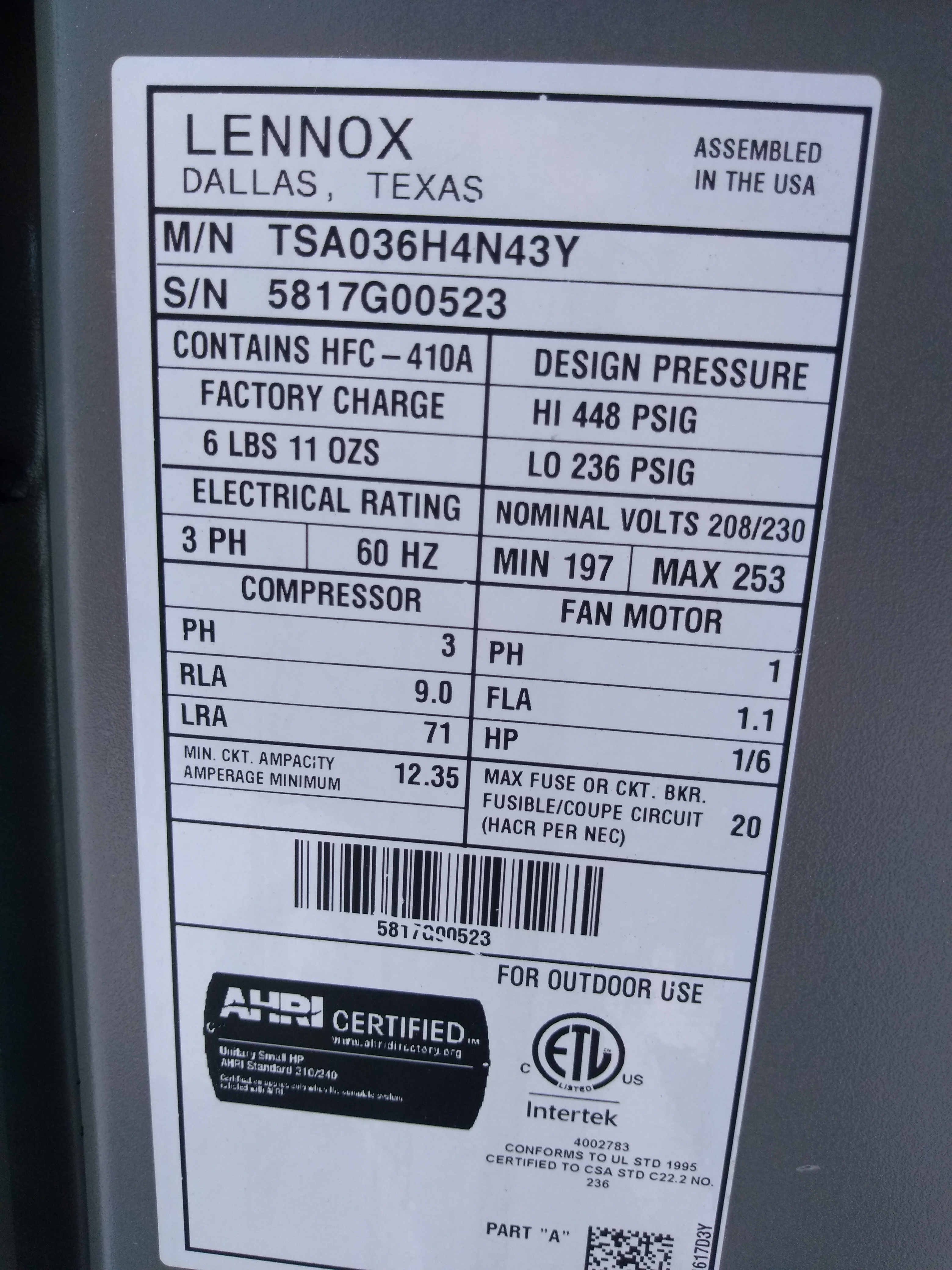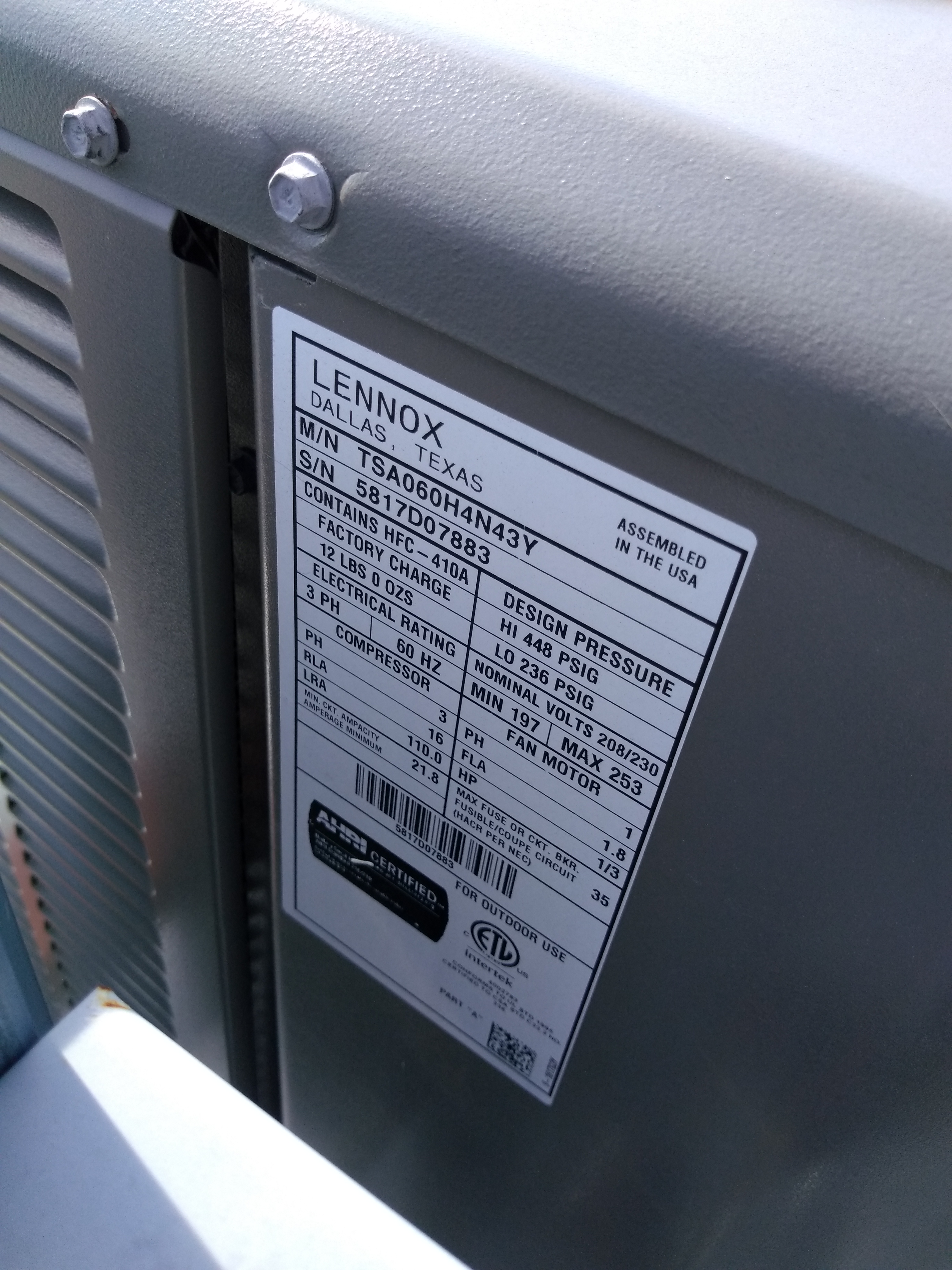 | 60 | n/a | 2015 | TSA060H4N42Y | 5815G13946 | 5 Ton | *** | Cond | |||