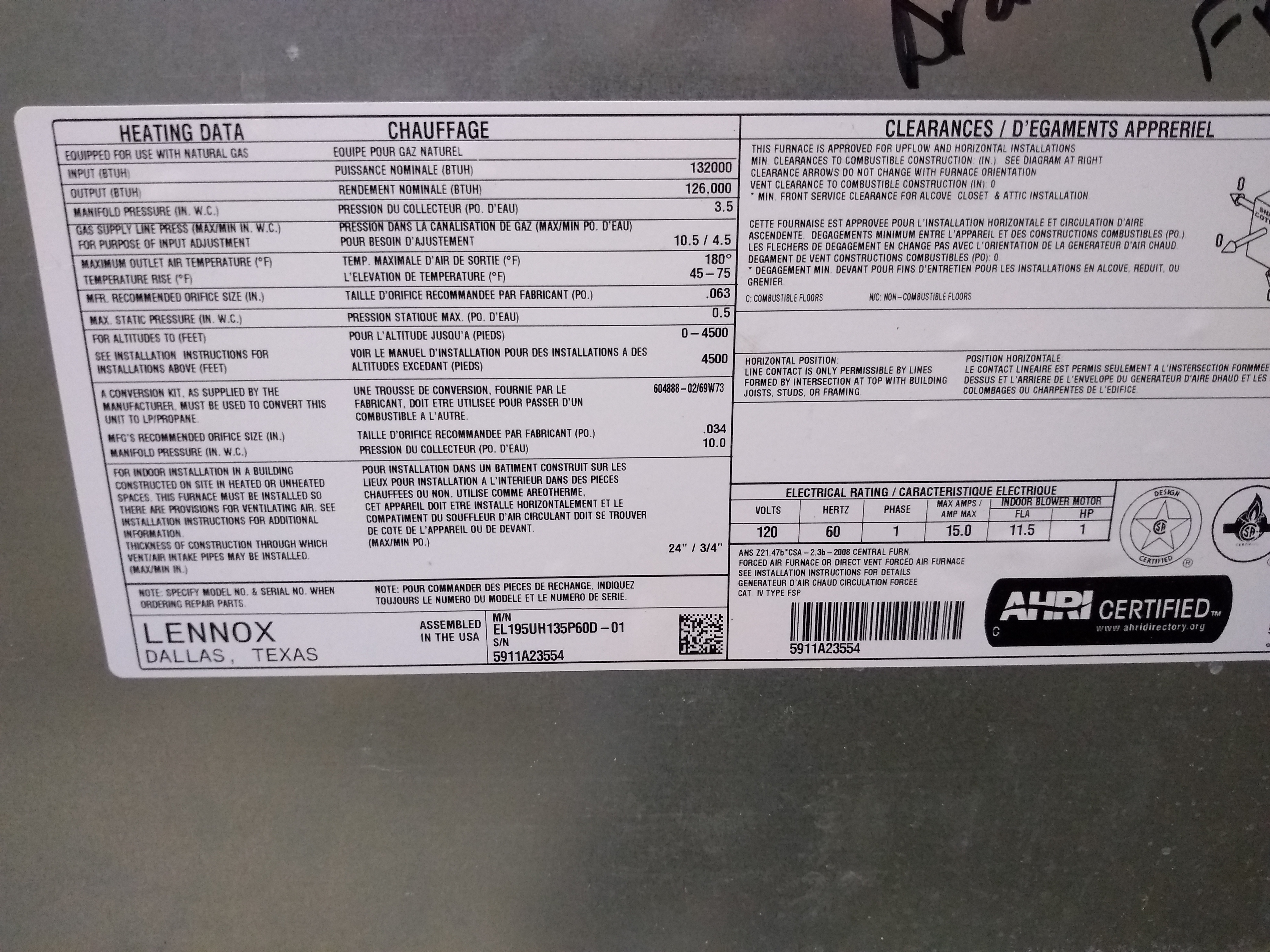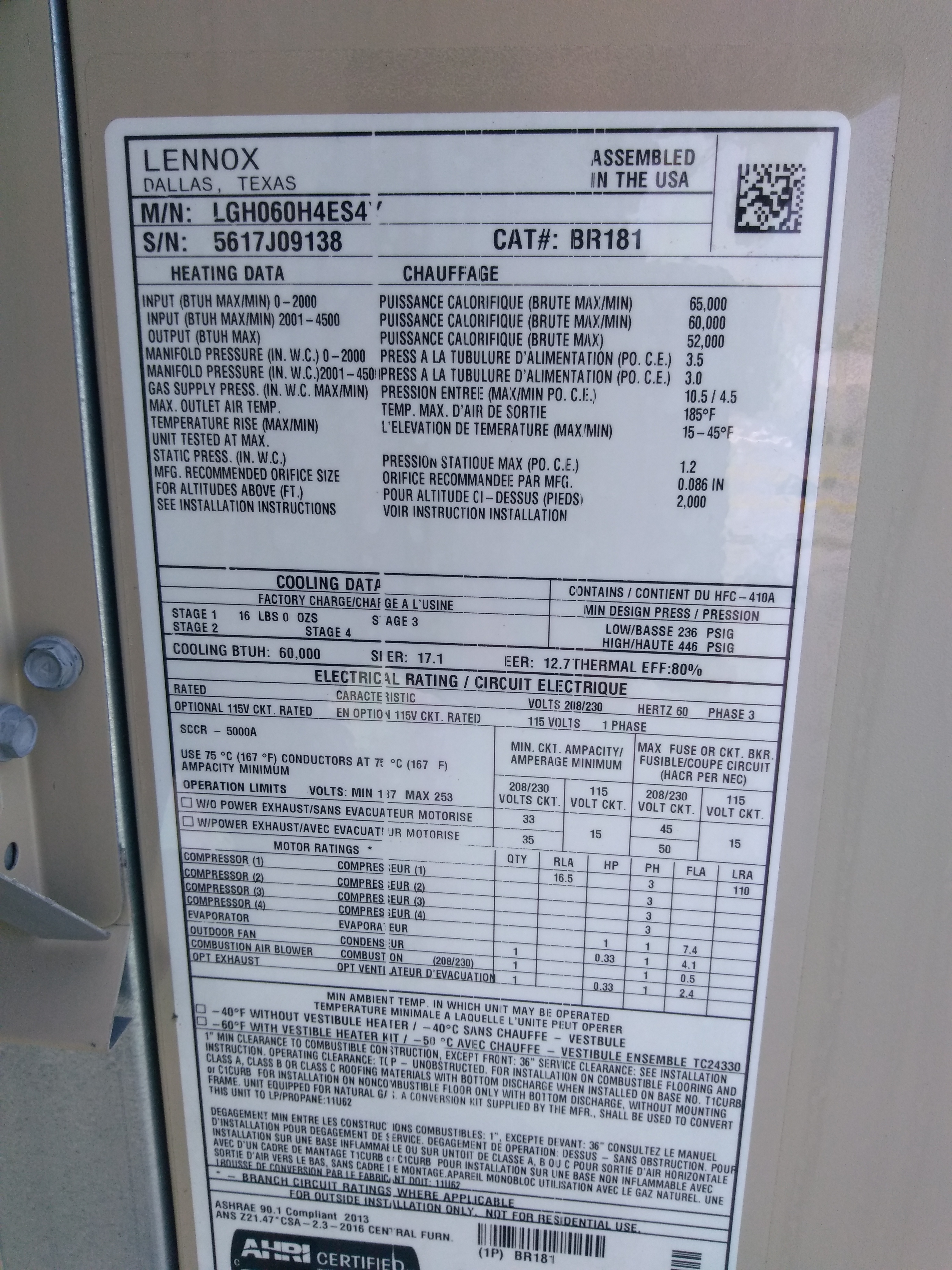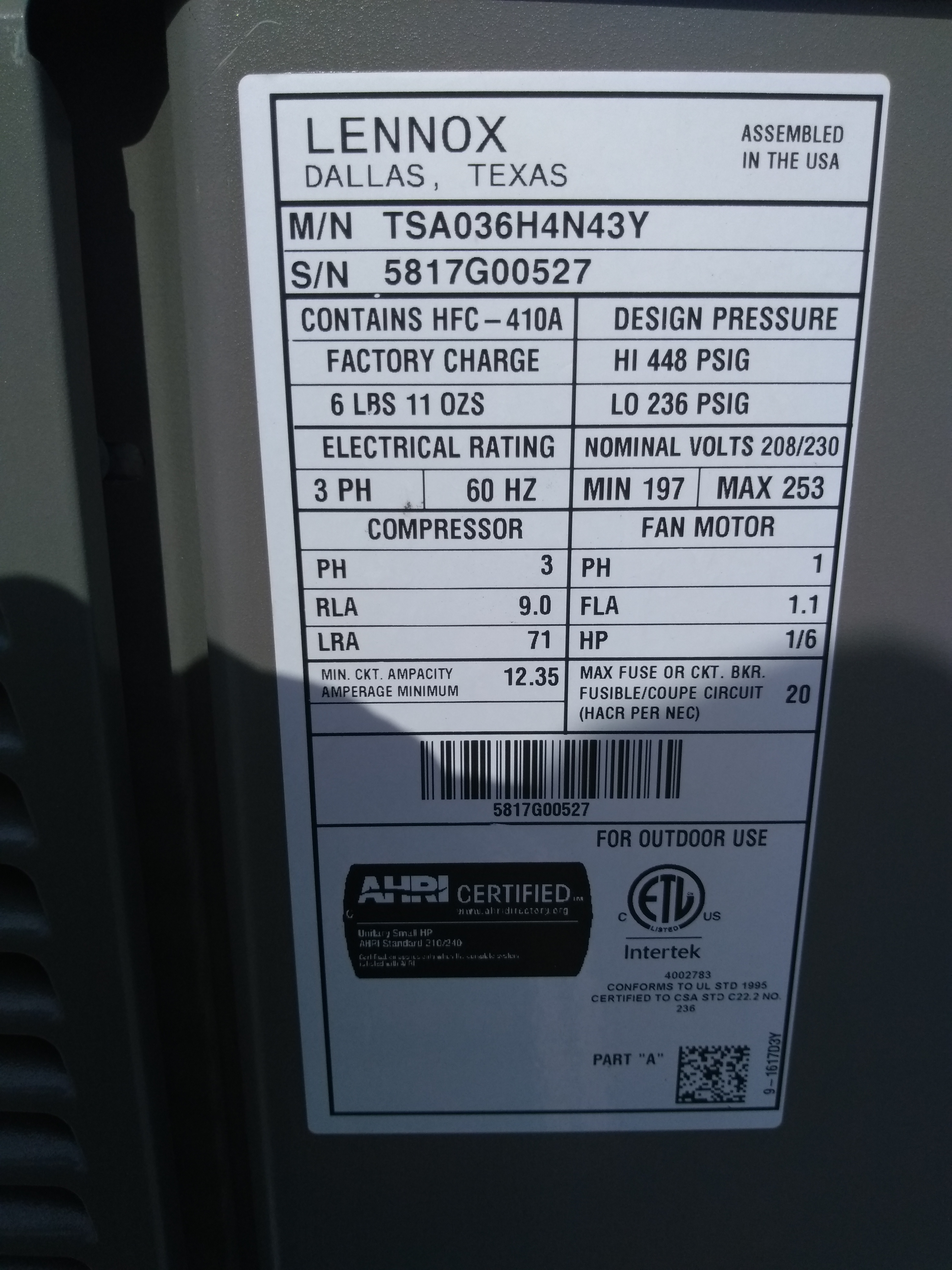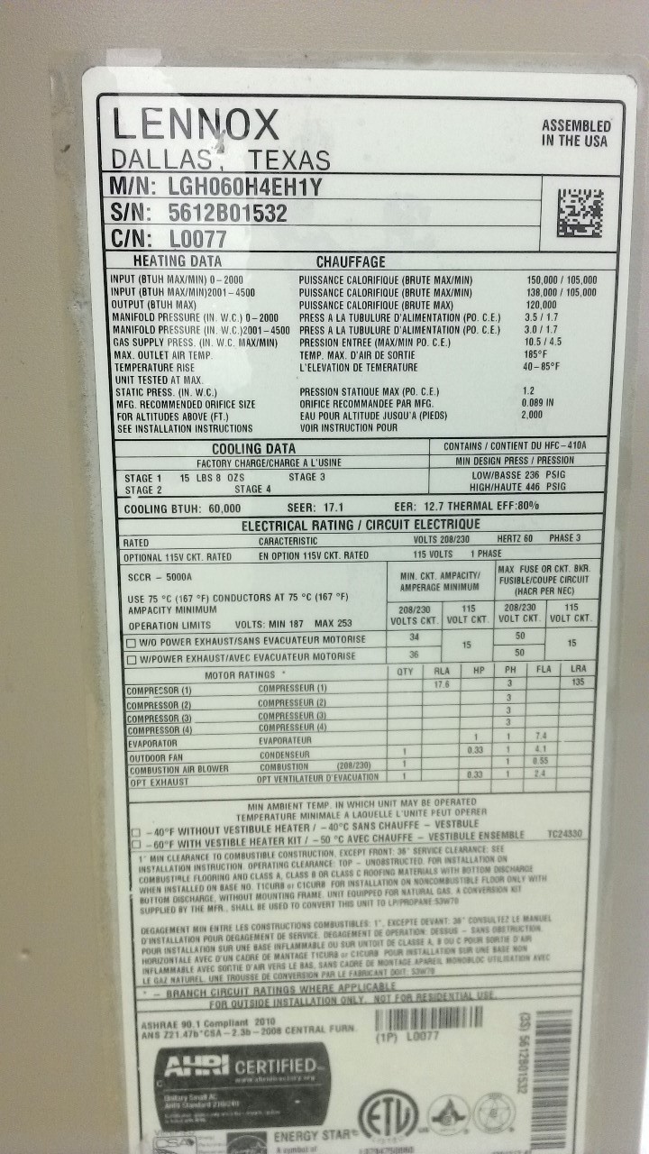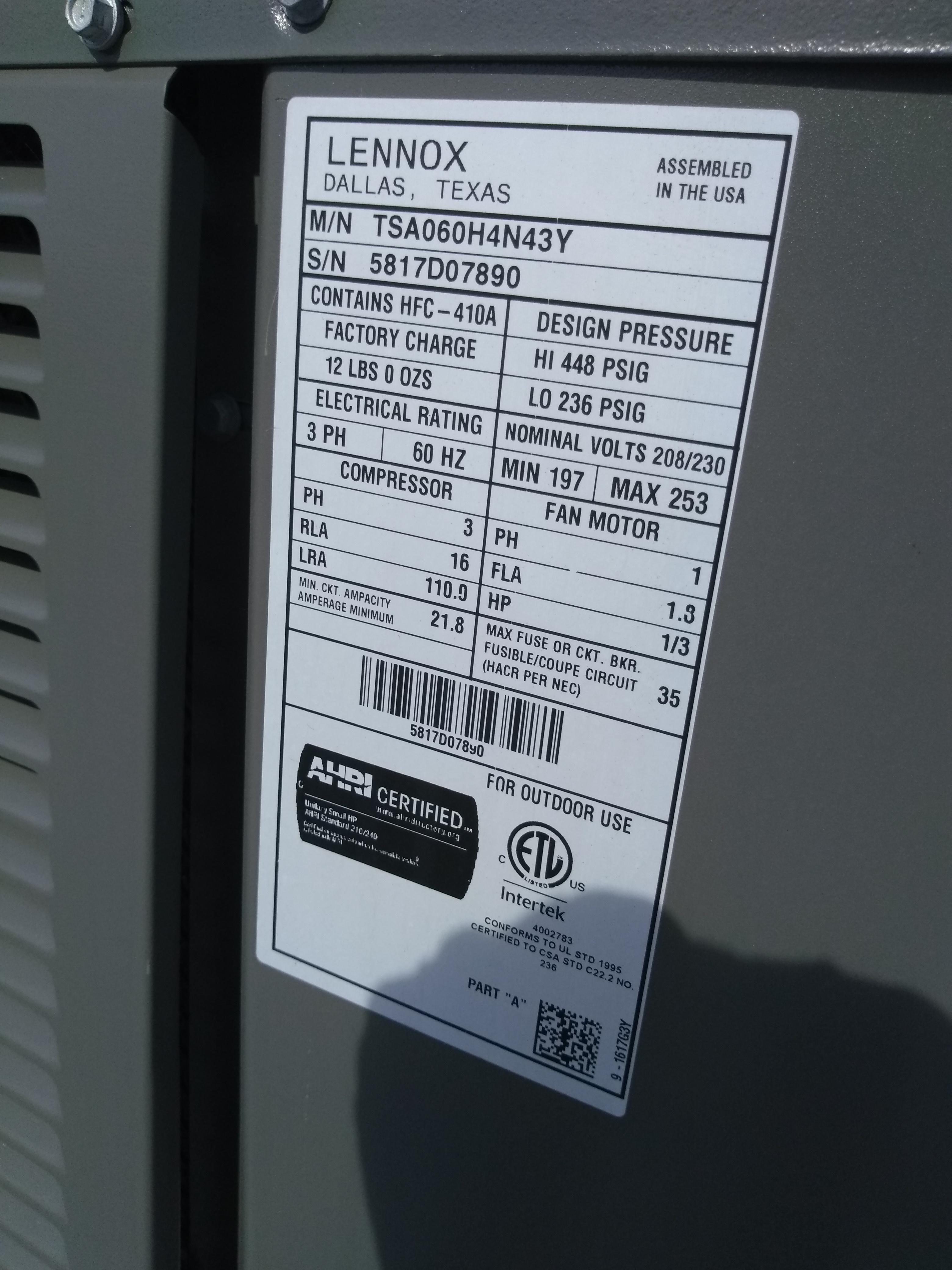 | 60 | n/a | 2015 | TSA060H4N42Y | 5815G13946 | 5 Ton | *** | Cond | |||