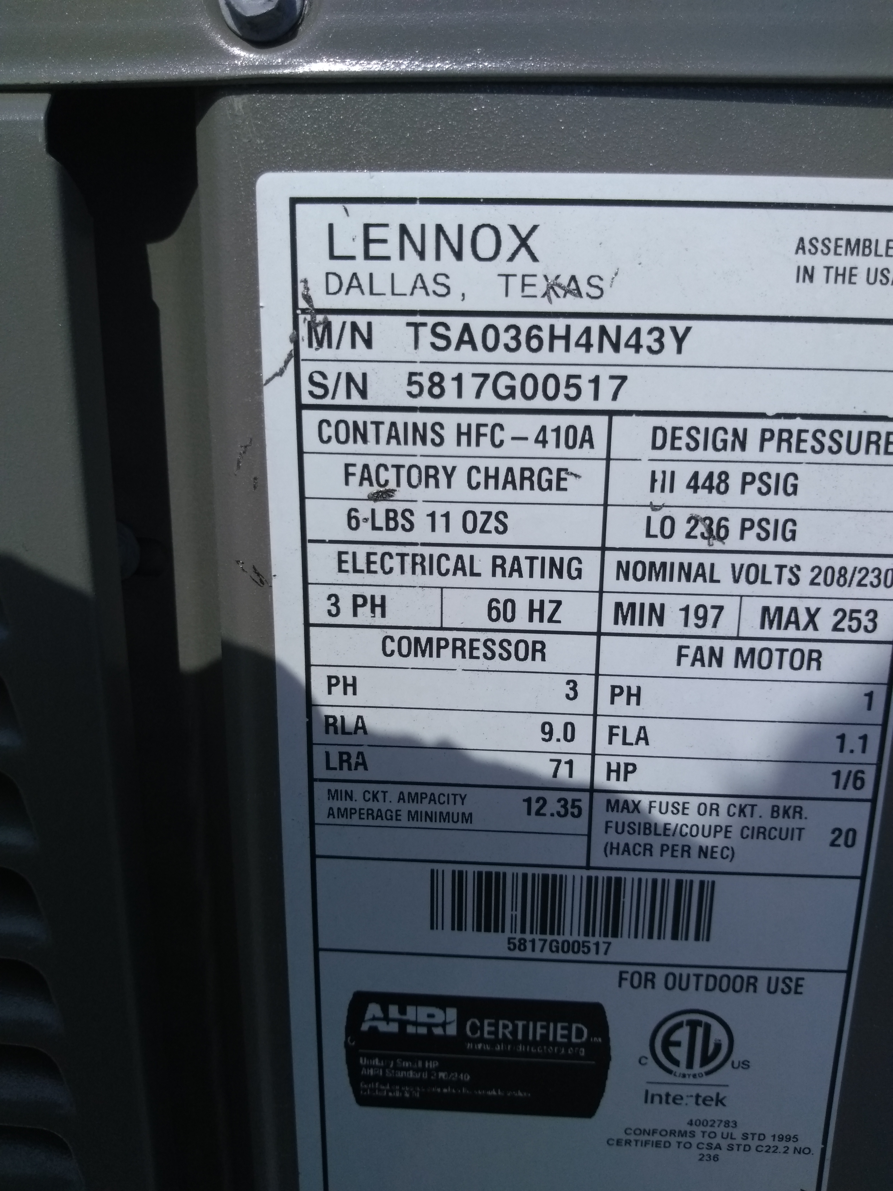 | 75 | 67 | 2014 | TSA060H4N42Y | 5814F12196 | 5 Ton | *** | Cond | |||