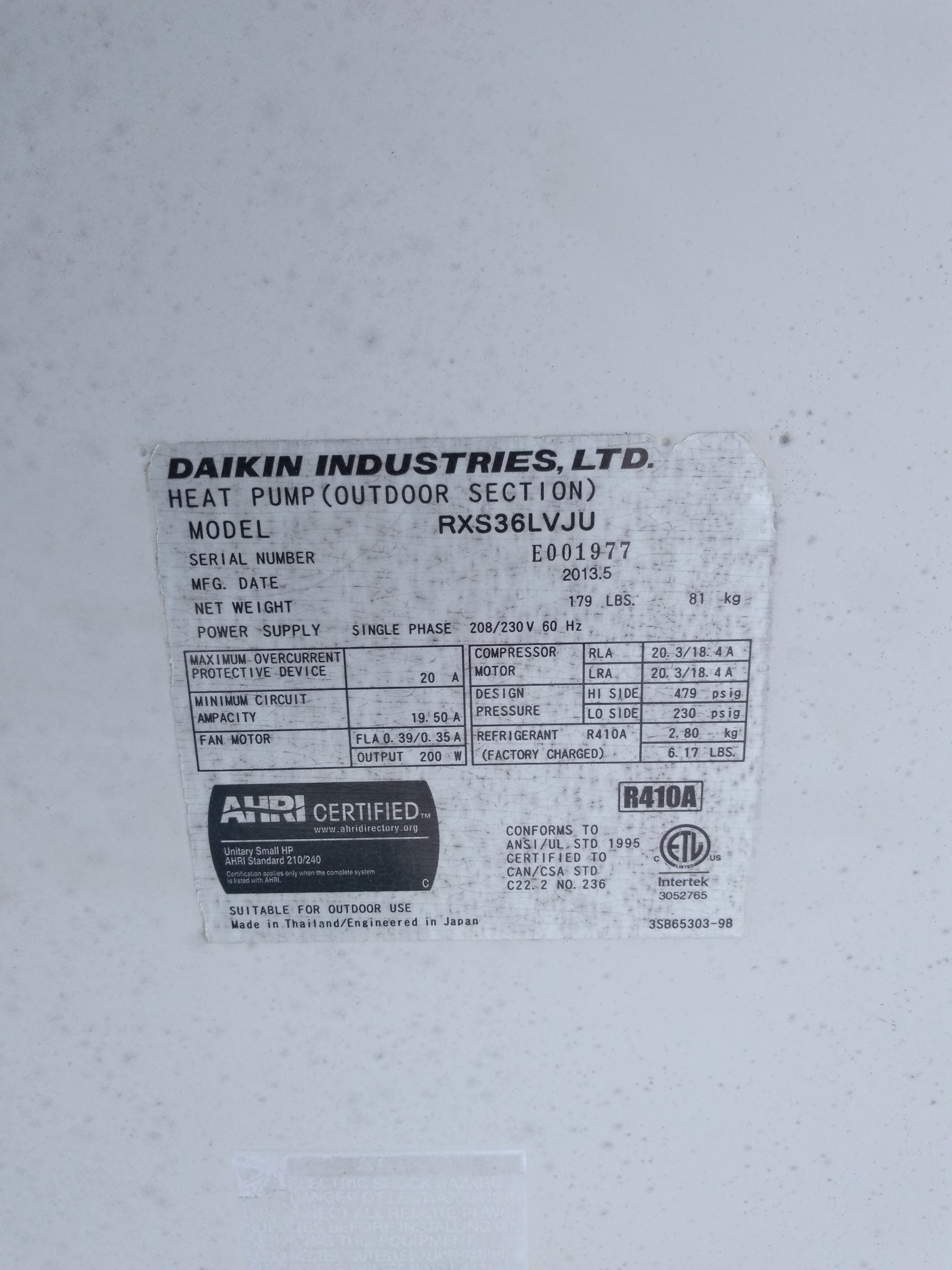 | M2 | n/a | 2013 | RXS36LVJU | E001977 | 3 Ton | Mini | ||||